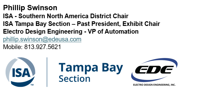 I also hope you can stay for at least the Expo portion of the Automation Summit and Expo (ASE) on Monday or Tuesday. The Tampa Bay Section collaborated with the ISA and are hosting over 60 vendors in large booths!